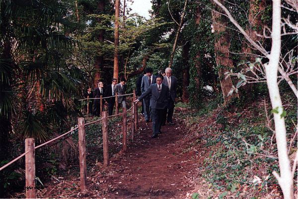 グビロガ丘中腹から射的場へ向かう遊歩道を開通式後に散策し、防空壕跡地へ向かう関係者一同。