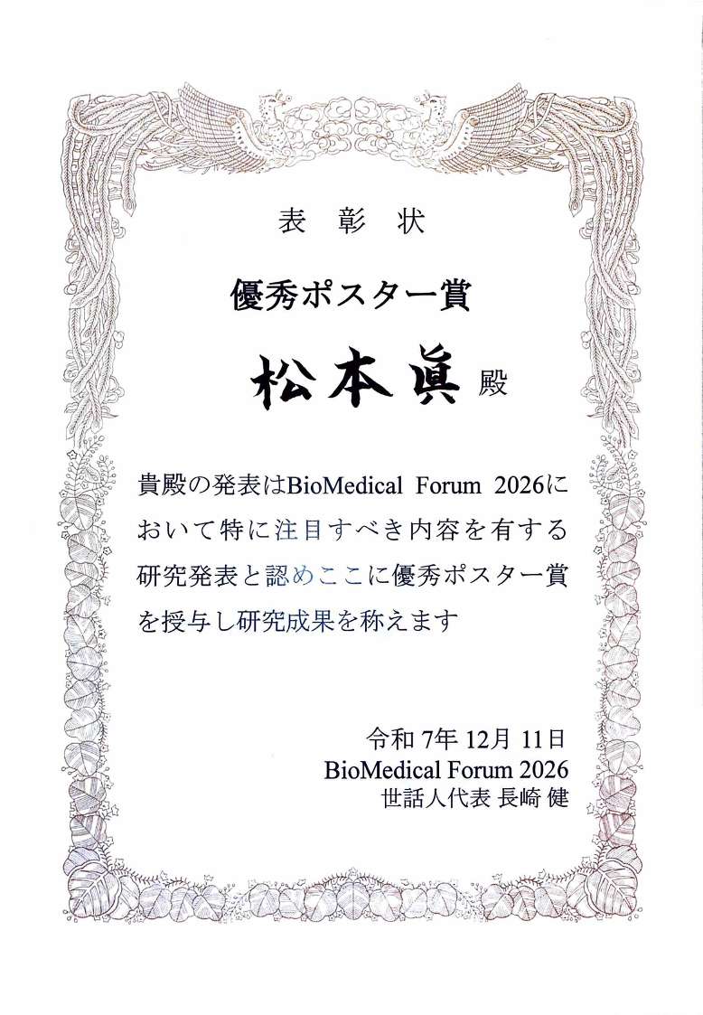 12/13 D2松本 眞さんが、BioMedical Forum 2026(大阪)で『優秀ポスター賞』を受賞しました。→ Biomedical ForumHP 本賞は、37件の発表者から6名が選出されたものです。おめでとうございます!。→ 長崎大学HP